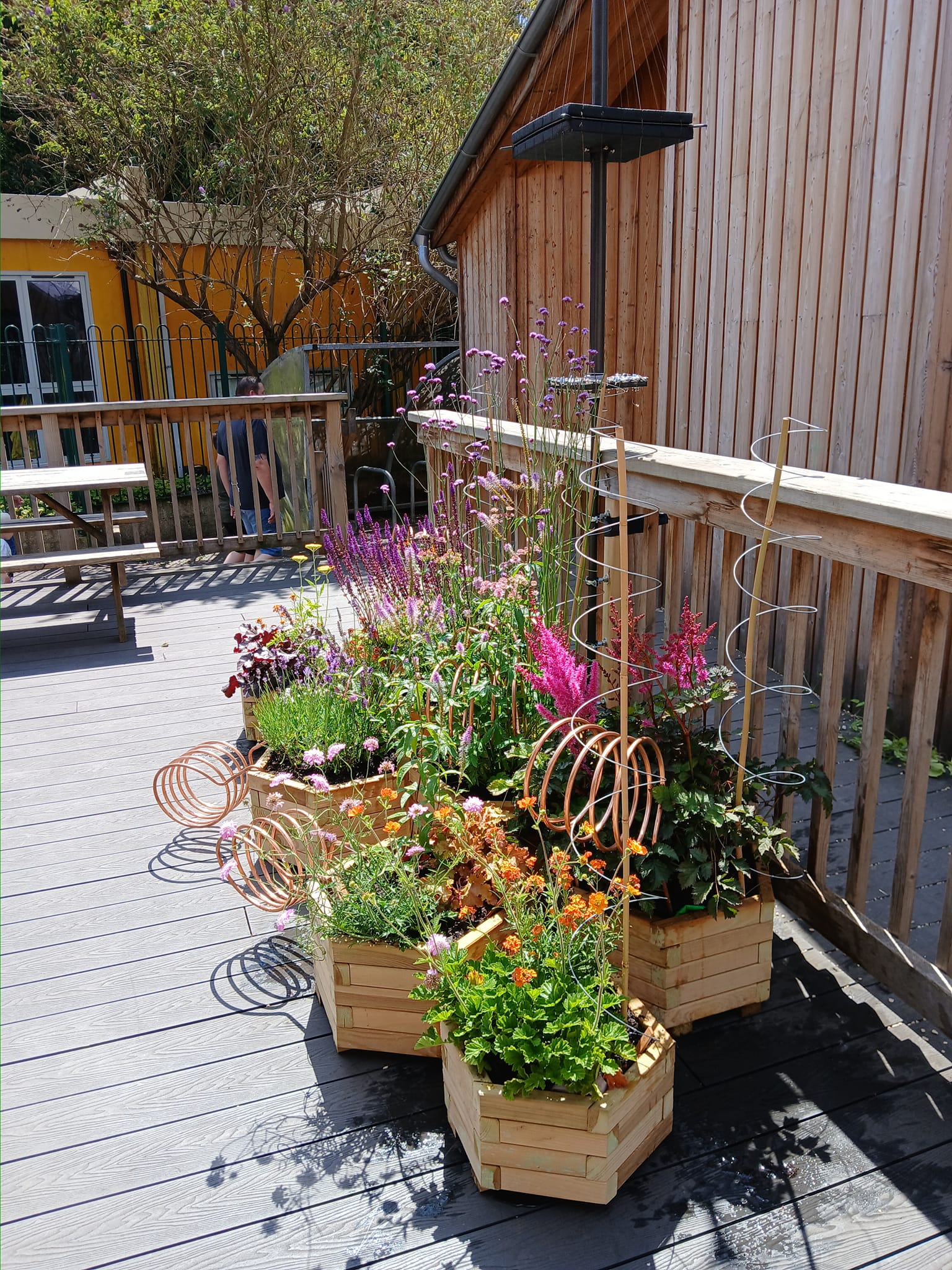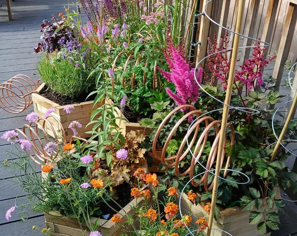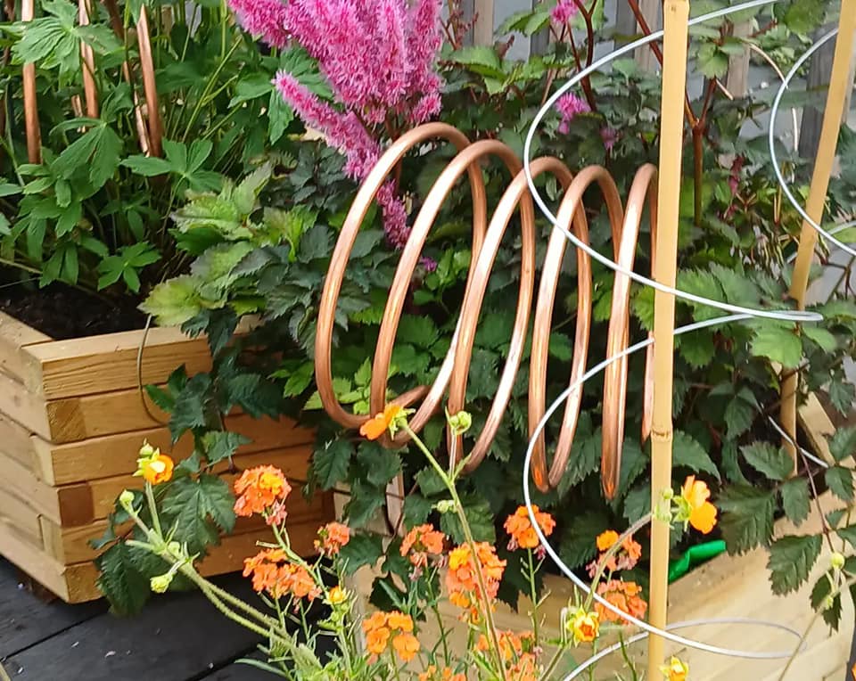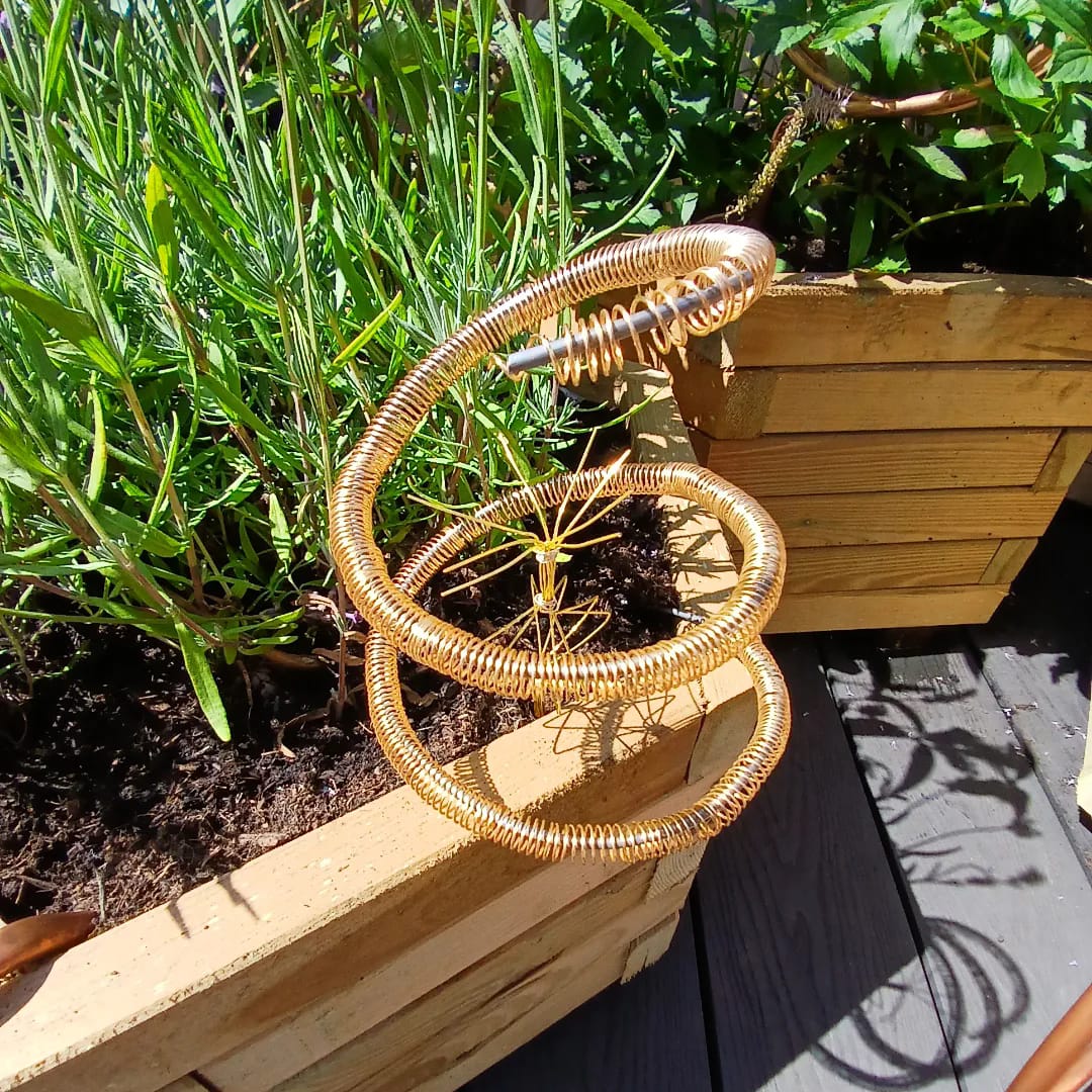 “Magz Hall’s Radio Air Garden uses plants which are known to absorb air pollution and are also great air pollinators promoting planting to improve air quality, the garden links in to the hundred-year long history of experimentation of using copper coils for growth, known as electro-culture. The central work is an aeolian antenna prototype made for Magz by inventor and artist Henry Dagg, to her specification riffing on the type of antenna used around 1882, the aim of which was to fertilize gardens with atmospheric electricity, initially designed by Brother Paulin, director of Beauvais School of Agriculture who called it a “geomagnetifere.“ to improve plant grown without the use of chemical fertilisers and later French Inventor and engineer Justin Christofleau who grew an electric vegetable garden potager électrique, using “electro-magnetic terro-celestial” power. Magz also rescaled copper radio transmitter coils, to also aid growth and use as plant support sculptures riffing on electroculture techniques.